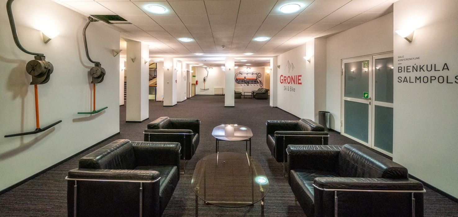 The first and largest space we offer at Gronie Ski & Bike is the Bieńkula conference room, created especially for the demanding needs of business clients. Due to its large area – 115 m², it is an ideal venue for large conferences, corporate meetings, or trainings that require ample space and advanced equipment. This spacious and bright room provides from 40 up to even 77 seats, allowing every company to create a very comfortable atmosphere for meetings and work. In addition, our guests have access to modern multimedia equipment, including a projector and screen, which facilitate presentations and effective information exchange. Bieńkula stands out not only for its functionality but also for the possibility to adapt its layout to the individual needs of the client, thus creating optimal conditions for work and interaction. It is a place where every meeting gains a special character, combining comfort with professionalism.